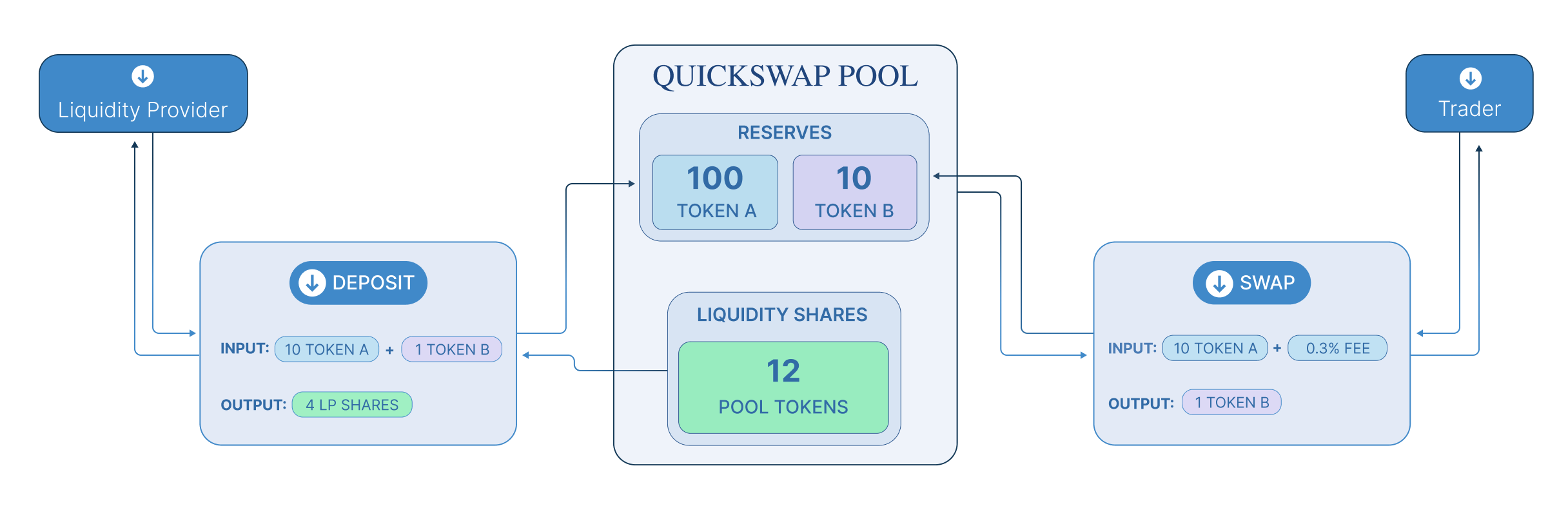 Each Quickswap smart contract, or pair, manages a liquidity pool made up of reserves of two ERC-20 tokens.
