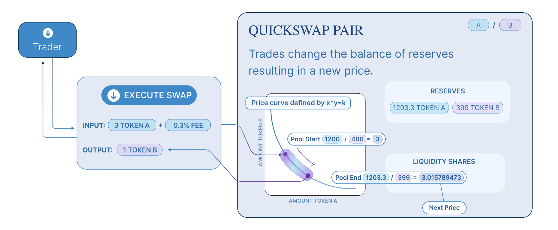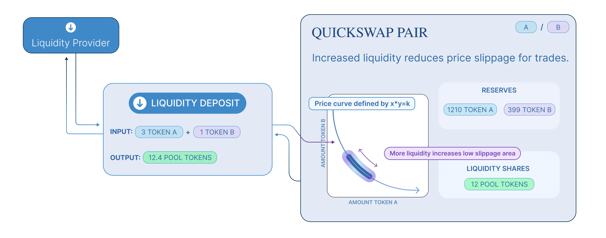 In practice, Quickswap applies a 0.30% fee to trades, which is added to reserves. As a result, each trade actually increases k. This functions as a payout to LPs, which is realized when they burn their pool tokens to withdraw their portion of total reserves. In the future, this fee may be reduced to 0.25%, with the remaining 0.05% withheld as a protocol-wide charge.